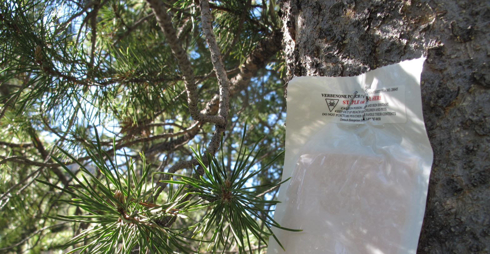 For now, the TreeFighter’s weapon of choice against the pine beetle is verbenone. When a tree has reached optimal beetle density, the bugs emit a pheromone that essentially tells those shopping for a new home that there’s no vacancy. Verbenone is a natural organic compound that mimics this pheremone, and a packet of it stapled to a live, healthy tree will ideally tell the beetles to keep moving, saving it from the certain death that accompanies the determined insects.